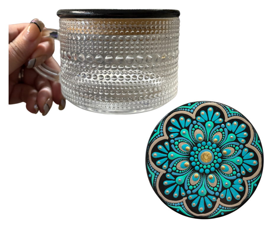 14 oz Clear Embossed Glass Mug with Hand painted Bamboo Lid